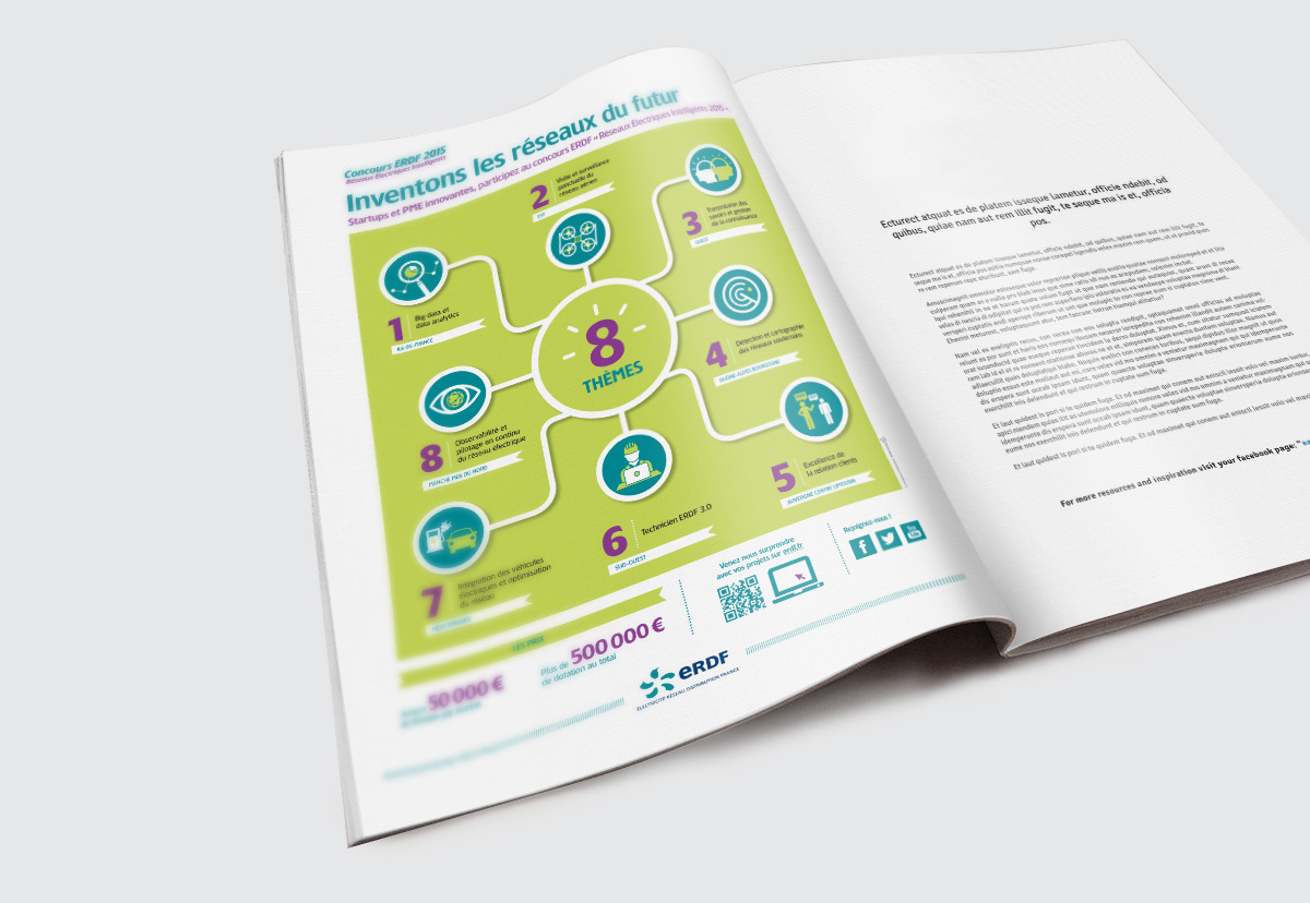 Ensemble de plusieurs documents en Flat design pour ErDF. Mistigris c’est tout les types de graphismes au delà des modes et tendances… L’illustratif structuré avait été utilisé dans les années 2000 pour la Société Générale Asset Management en motion design (Flash à l’époque) pour illustrer les chiffres des tendances boursières avec de fréquentes mises à jour.