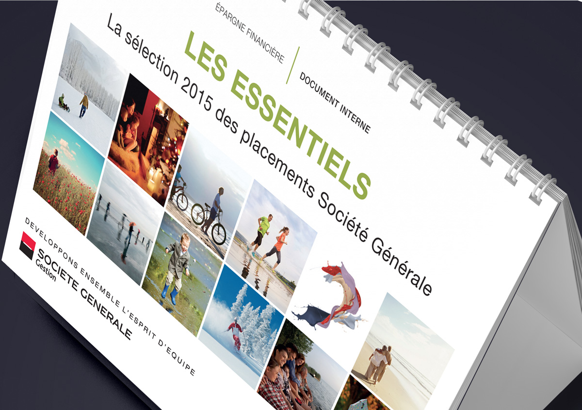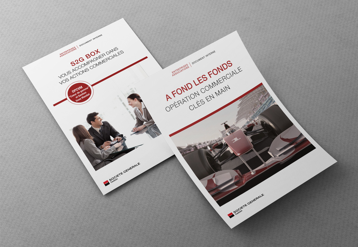 Une box incentive pour motiver les équipes commerciales et sensibiliser aux pratiques avec une clef usb, plusieurs depliants… Un nuancier de gamme de produit, pour rapidement et efficacement orienté le client vers la solution adéquate en communicant les informations de manière claire et directe, des calendriers de bureau en tryptique, une face produit, une face date pour vehiculer l’identité Société Générale sur tout les bureaux. des plaquettes d’informations commerciales.