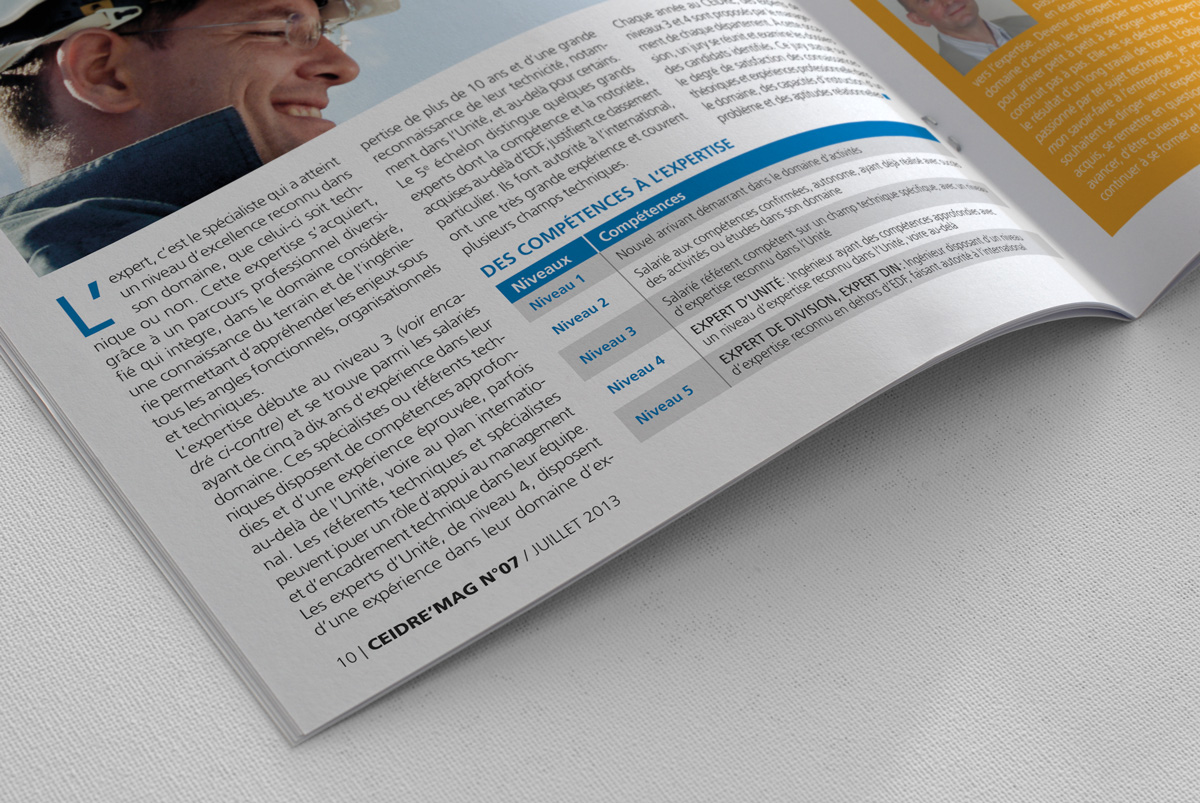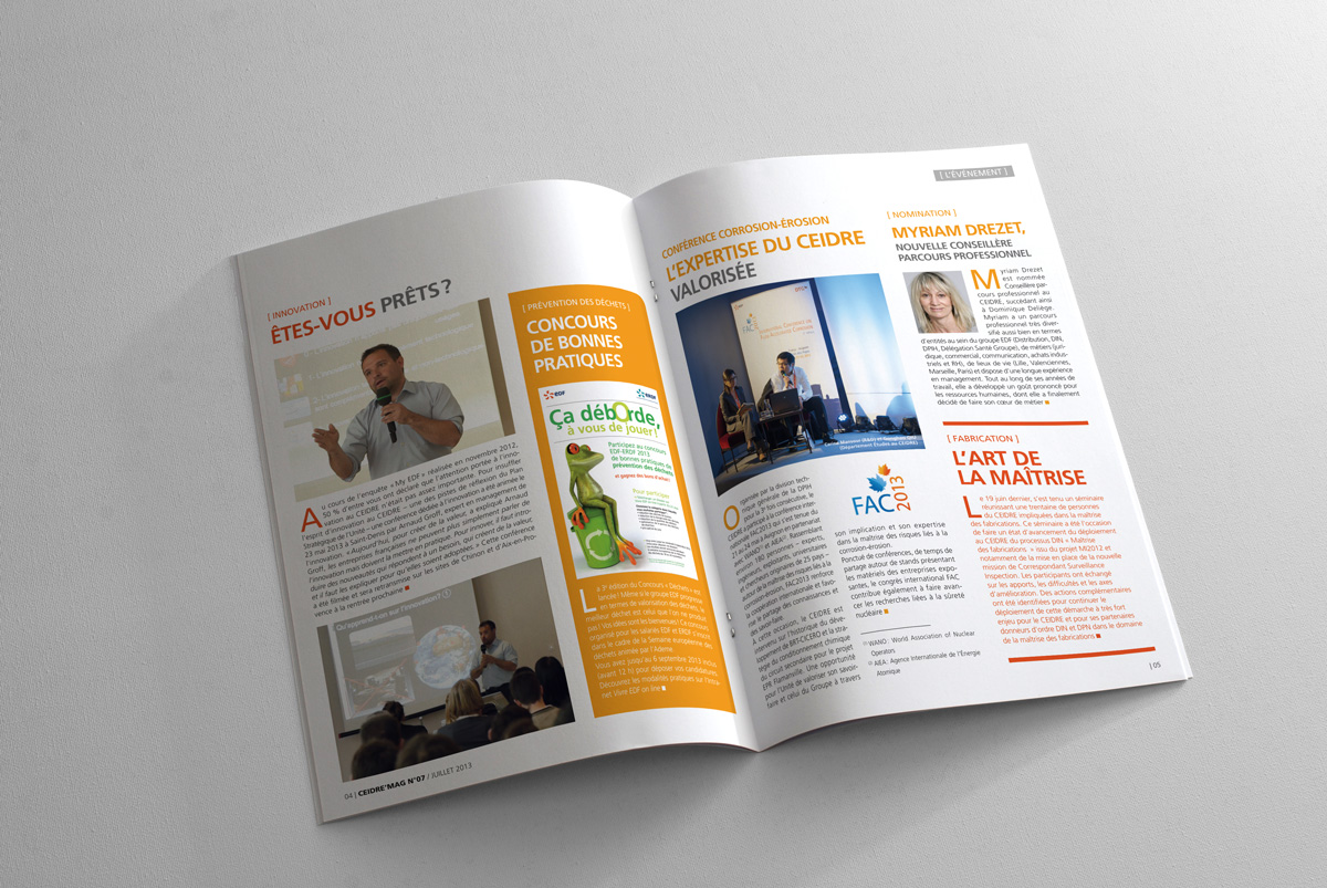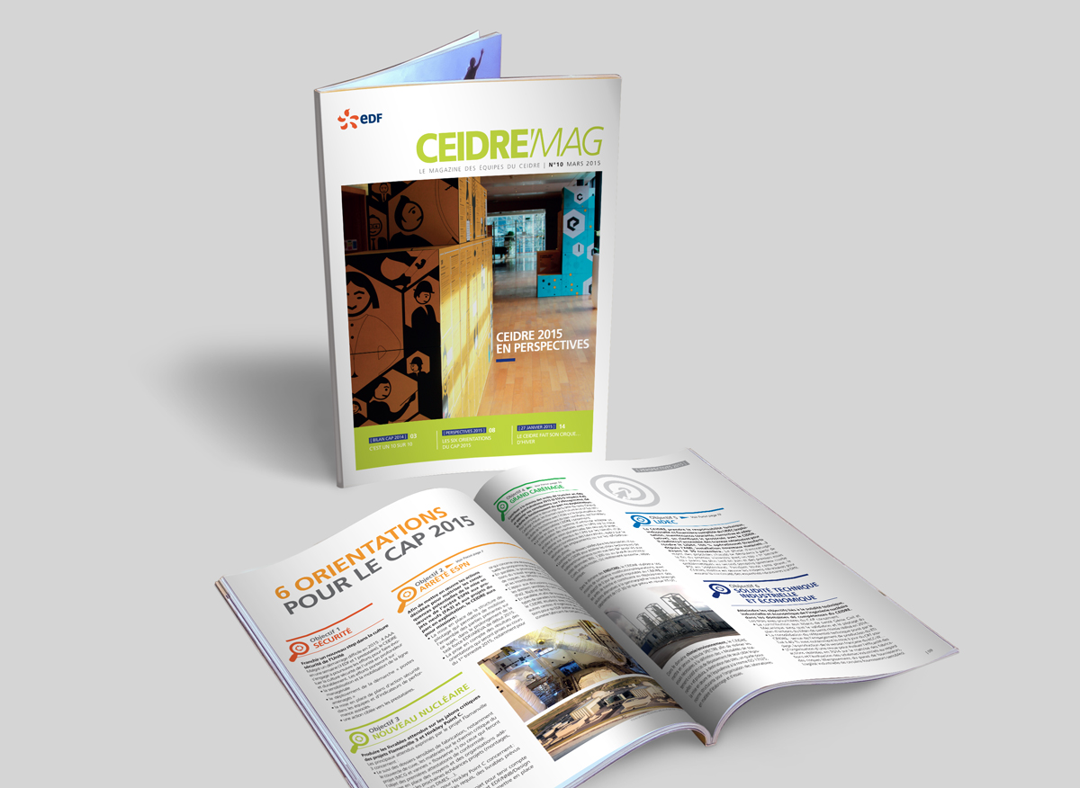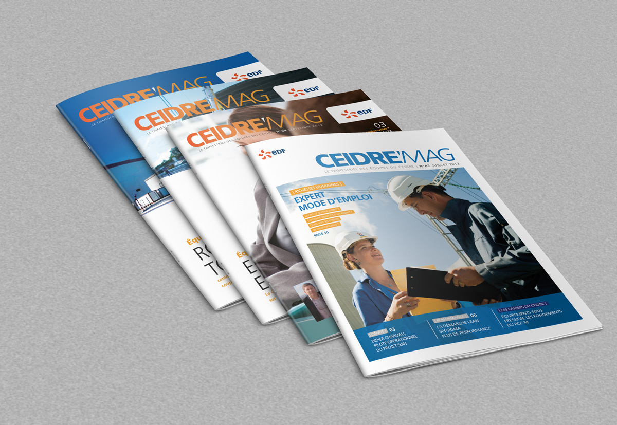 Le Magazine Ceidre est un magazine interne d’information dos carré collé quadri. L’accompagnement éditorial, la maquette et sa réalisation organisé avec Mistigris a permis à EDF de produire un magazine de qualité distribué et lu par l’ensemble du personnel du Ceidre.